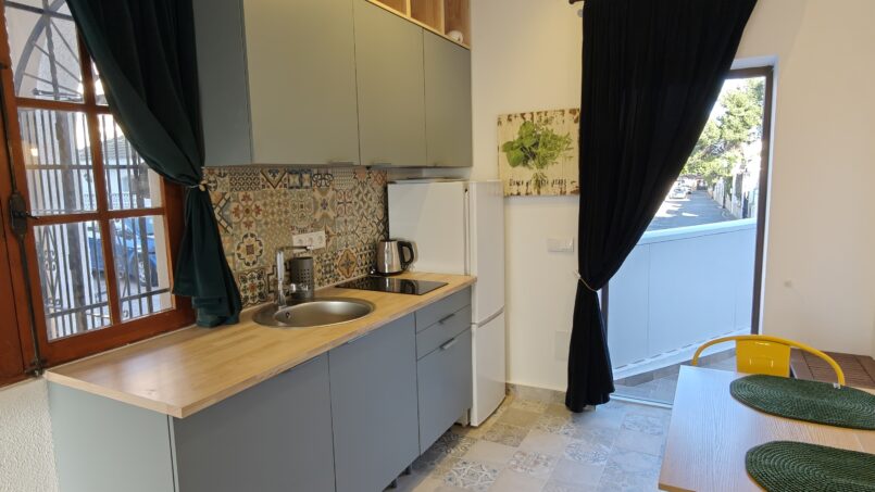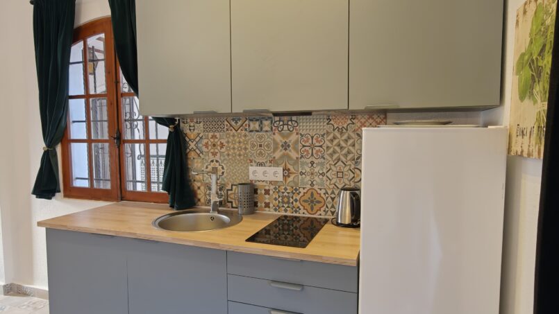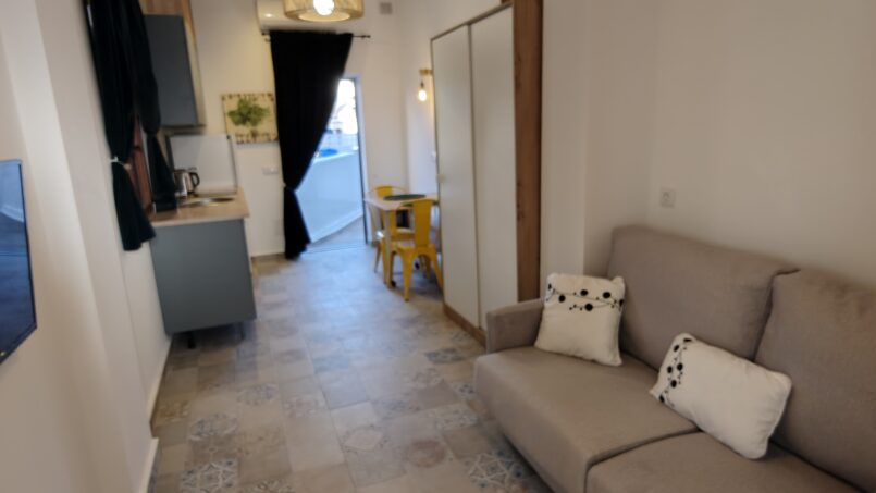 Inside, the studio is thoughtfully designed with a high-quality Italian-style sofa bed featuring a comfortable double mattress (1.4m x 1.95m), providing a restful night’s sleep while maximizing space during the day.