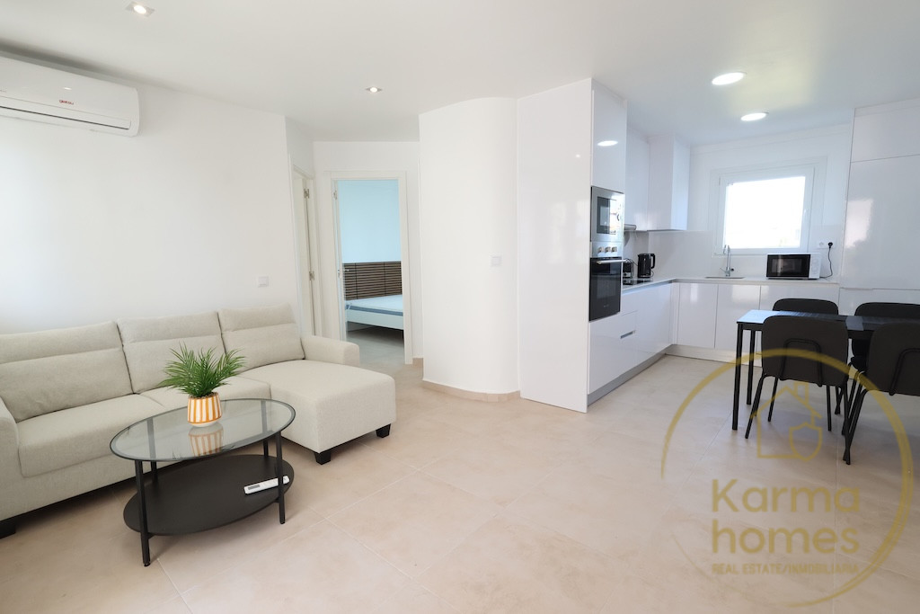 The property boasts 57 m² of well-designed living space, featuring two bright bedrooms and a contemporary bathroom. The open-plan kitchen, living, and dining area creates a spacious and inviting atmosphere, perfect for relaxing or entertaining. From here, you have access to a terrace—ideal for enjoying the sun all year round.