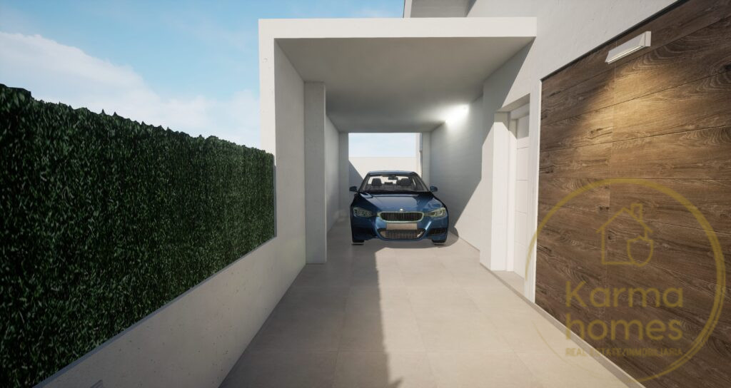 Outdoor spaces are fully equipped with power sockets, TV aerial connections, and water points in the solarium, first-floor terrace, and garden. A covered above-ground garage with white insulated sandwich panels adds practicality, while the private swimming pool — complete with built-in steps, seating, lighting, and an outdoor shower — provides the perfect setting to relax and enjoy the Mediterranean lifestyle.